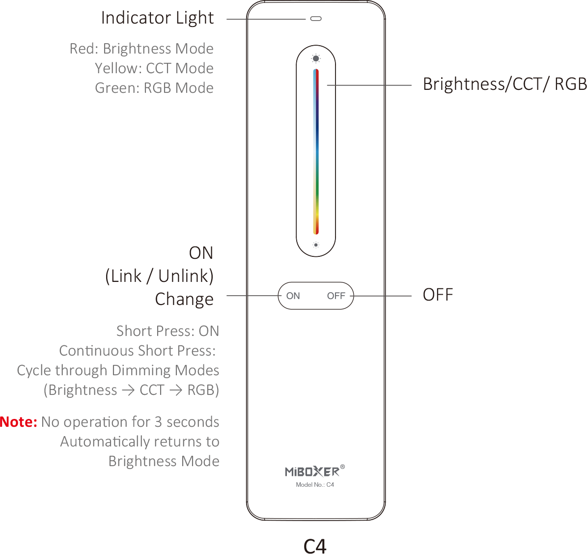 MiBoxer C4 on intuitiivne ja usaldusväärne juhtpult nutikate LED-valgusti juhtimiseks. Selge nuppude loogika võimaldab kiiresti reguleerida heledust, valida värvitemperatuuri (CCT) või luua RGB-valgusega sobiva meeleolu.