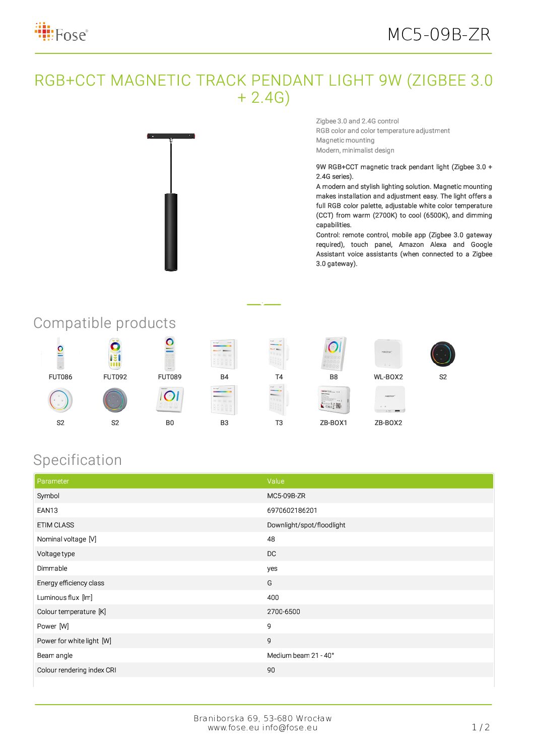 Magnetsiini rippvalgusti 48V RGB+CCT 9W Zigbee 3.0 + 2.4G
