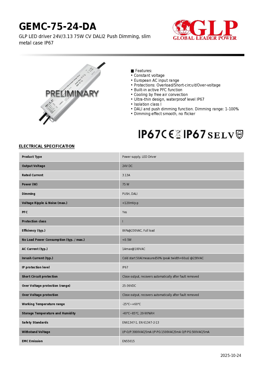 Toiteplokk 24V, DALI/PUSH DIM 75W IP67